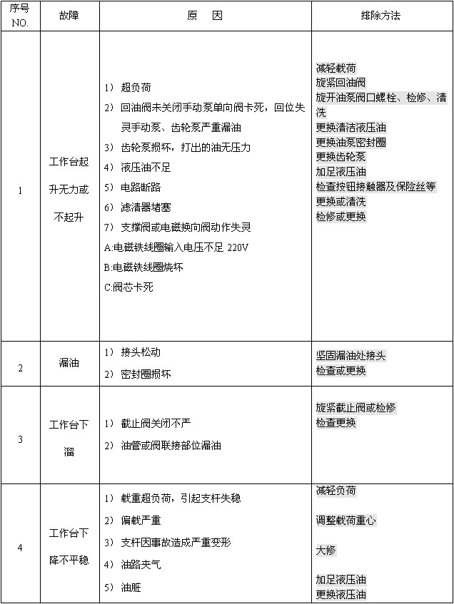 Working process: First, start the motor start switch, the motor rotates, the gear pump pumps oil, the oil cylinder extends, and the platform lifts; When reaching the required working height, press the motor stop button to stop the platform from lifting, and then you can start working. When descending, press the electromagnet on button. At this time, the oil cylinder returns oil and the platform descends by its own weight. After reaching the original position, turn off the electromagnet (power off).
